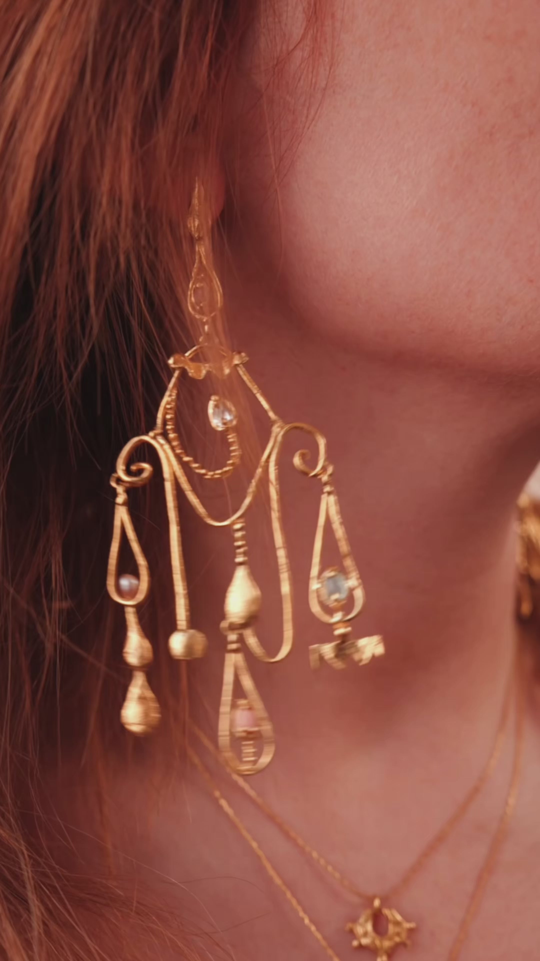Ruby wearing gold statement earrings and necklace